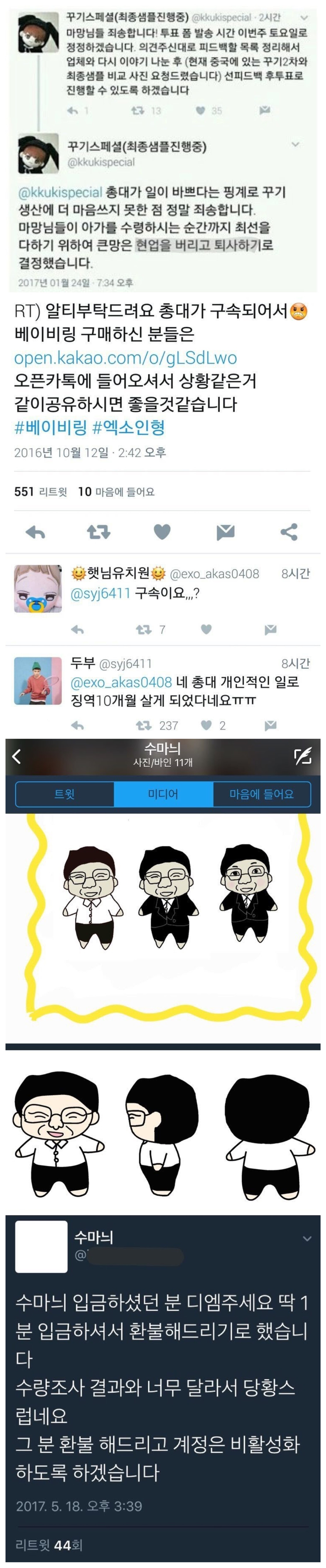 순서대로 1. 총대가 인형 제작을 위해 현업 버림 = 퇴사 2. 총대가 개인적인 일로 징역 10개월 구속됨 3. SM 사장 이수만 인형 ㅋㅋㅋㅋㅋㅋㅋㅋㅋㅋㅋㅋㅋ ㅋㅋ 개인적인 일로 징역 살 일이 뭐 있지ㅋㅋㅋㅋㅋㅋㅋㅋㅋㅋㅋ 0