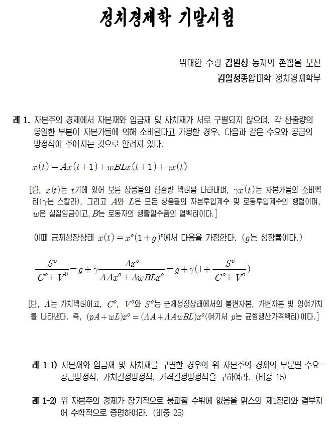 | Subject | 김일성대학 정치경제학과 기말시험문제라고 합니다. |