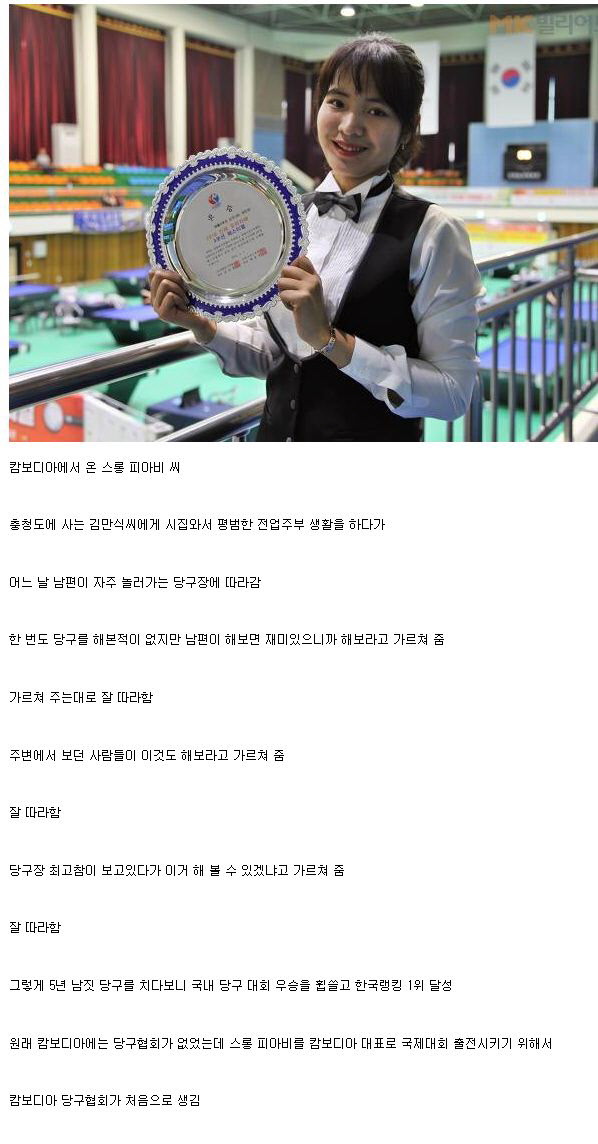 아래는 링크 기사 발췌 스롱 피아비는 지난해 1월 당구 선수로 데뷔한 뒤 같은 해 12월까지 3개 전국대회에서 우승해 한국 여자당구 랭킹 1위에 올랐다. 그는 이에 앞서 2014년부터 2016년까지 아마추어 최고 무대로 꼽히는 문화체육관광부 장관기 대회에서 우승컵을 놓치지 않았다. 허미... 1