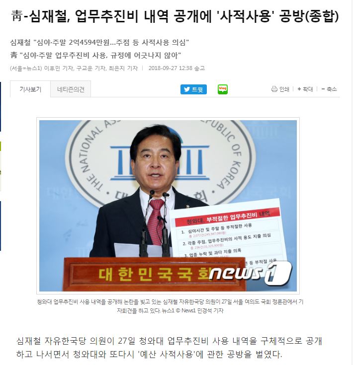 | Subject | 靑-심재철, 업무추진비 내역 공개에 '사적사용' 공방 |