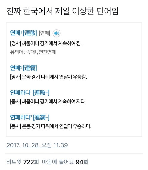 이런 '연패' 같은 경우는 한자를 같이 병기해야 하지 않나, 마 그런 생각을.. 지는 것도 되고 이기는(우승하는) 것도 되니