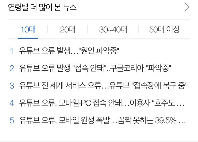 어제 유튜브 장애 났을 때 네이버 뉴스랭킹 상황이라고 합니다. 2
