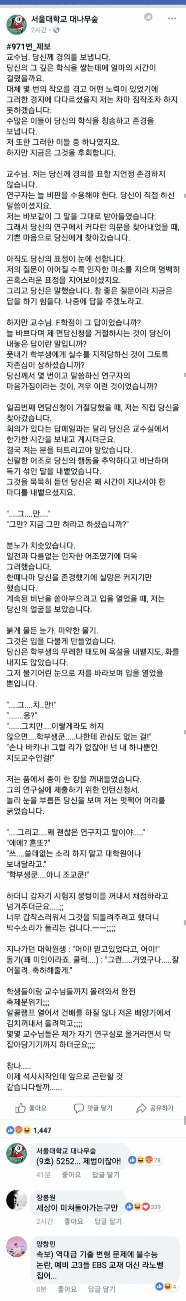 | Subject | 서울대 대나무숲에서 논란중인 F학점 준 교수님. |