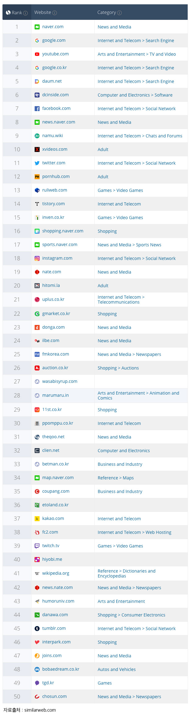 2019년 1월 시밀러웹 기준 한국 사이트 접속 순위입니다. 0