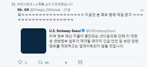 | Subject | 주한미국대사관 공식 트위터 계정의 일시 정지 이유 |