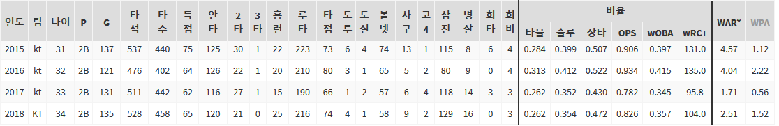 하락세가 보이긴 하는데 주장이기도 했고, 첫 FA 때 워낙 잘해줘서 KT가 나쁘지 않게 챙겨준 것 같네요.