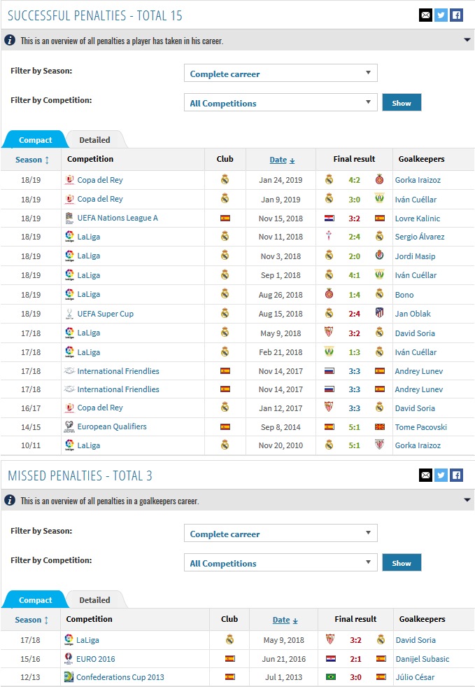 2019. 01. 24. Real Madrid 4 (Ramos 42', 77') - 2 Girona 라모스가 또 PK를 파넨카 킥으로 차 넣었습니다. 그리고 또 머리로도 골을 추가. 라모스가 커리어 동안 파넨카 킥으로 넣은 PK는 6개. 승부차기에서 넣은 것을 포함하면 총 7개입니다. 유로 2012 준결승 포르투갈전 (승부차기) 유로 2016 지역 예선 마케도니아전 16-17 코파 델 레이 세비야전 18-19 라 리가 지로나전 18-19 라 리가 바야돌리드전 18-19 라 리가 셀타 비고전 18-19 코파 델 레이 지로나전 라모스의 커리어 PK 기록은 총 18회 시도, 15회 성공. 성공률 83% 올 시즌 레알 마드리드에서 모든 대회를 통틀어 5골 이상 넣은 선수는 단 3명입니다. 카림 벤제마 13골 가레스 베일 10골 세르히오 라모스 9골 심지어 베일은 저 중에 3골이 클럽 월드컵 골이라고... 0