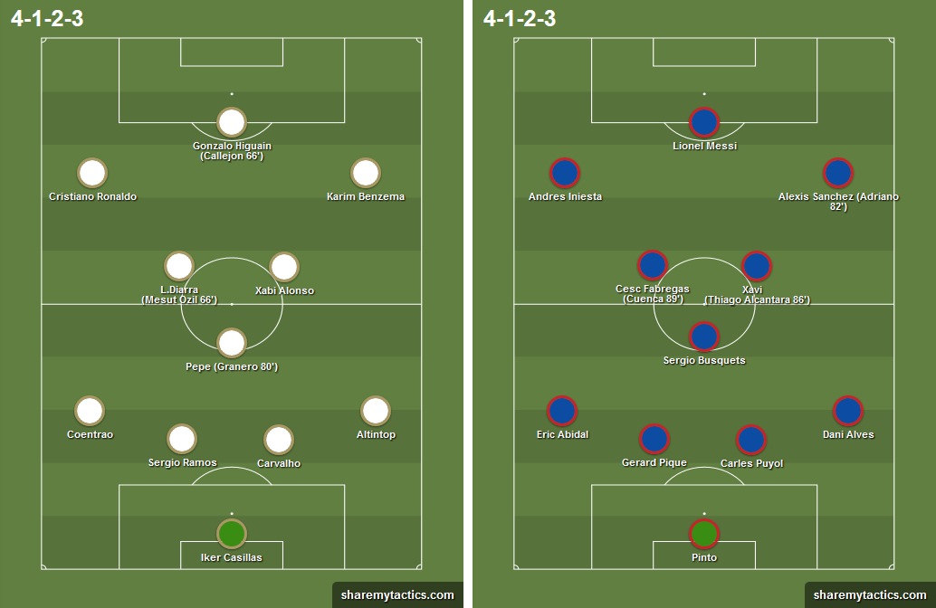 2012. 01. 18. Real Madrid 1 (C.Ronaldo 10') - 2 Barcelona (Puyol 49', Abidal 77') 정말 의외의 이야기지만 사실입니다. 21세기 이후 바르셀로나와 레알 마드리드는 코파 델 레이에서 6번을 맞붙었는데 그 중 바르셀로나가 승리한 경기는 이 경기가 유일합니다. 물론 이 11-12 코파 8강 시리즈는 2차전에서 무승부를 기록하며 바르셀로나가 4강 진출에 상공했지만... 21세기의 코파 엘클라시코는 8강에서 1번, 4강에서 1번, 그리고 결승전에서 2번이 성사되었는데 이 시리즈를 제외하고는 모두 레알 마드리드가 승리했습니다. 결승전이 2번이었으니 그 대회들에서 레알 마드리드가 코파 델 레이 2개를 추가. 바르셀로나의 21세기 코파 엘클라시코 전적은 1승 2무 3패입니다. 2011. 04. 20. vs RMA (N) 0-1 L 2012. 01. 18. vs RMA (A) 2-1 W 2012. 01. 25. vs RMA (H) 2-2 D 2013. 01. 30. vs RMA (H) 1-1 D 2013. 02. 26. vs RMA (A) 1-3 L 2014. 04. 16. vs RMA (N) 1-2 L 참고로 리오넬 메시는 레알 마드리드를 코파 델 레이에서 6번 만나는 동안 단 한 번도 득점하지 못했습니다. 물론 윗 영상에서도 보이시겠지만 골만 못넣었을 뿐이지 다른건 다했고... 꼭 이런 기록이 언급되면 메시가 골을 넣던데 과연 내일은..? 0