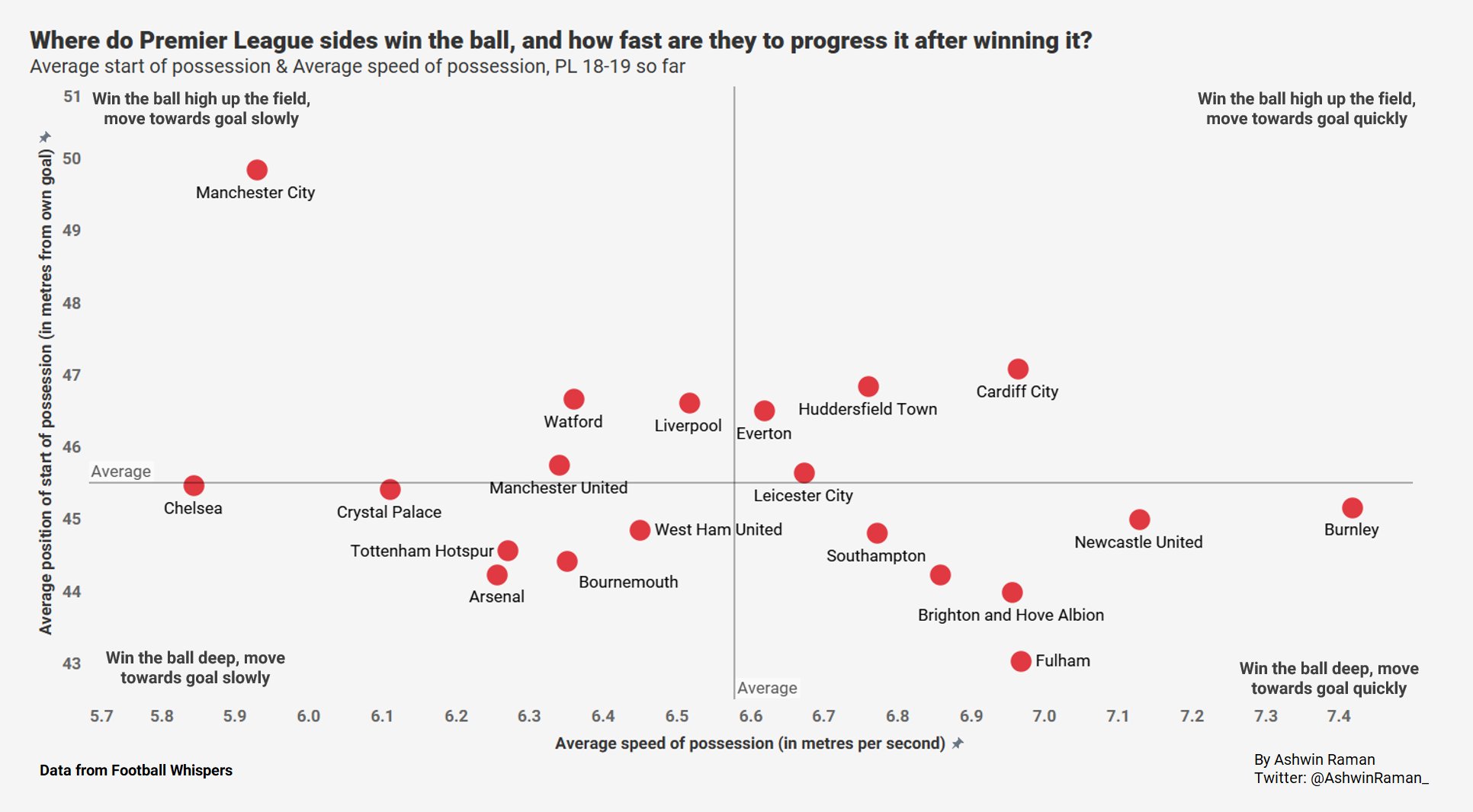 저도 생각을 좀 해봤는데 카운터 어택의 비중을 많이 줄이고 생각해보면 납득이 가는 것 같아요. 실제로 공을 빠르게 전진시키면서 마무리까지 할 수 있는 역량은 당연히 빅클럽이 월등하겠지만 실제로 그러한 장면들은 경기에서 많이 나오질 않죠. 중간에 있는 솔샤르 맨유의 속공 찬스가 고작 1.13개로 리그 1위를 하는 것처럼... 게다가 요즘 시대처럼 후방 빌드업부터 차근차근 가둬놓고 패는 방식들을 강팀들이 사용하는 경우에는 강팀들이 약팀들에 비해 그러한 찬스를 만들기 더더욱 힘들 것이고. 맨시티나 리버풀이 빌드업을 중도에 차단하면서 역습으로 골을 넣는 장면이 머리에는 많이 인식되어 있지만 실제로 경기 양상은 수비지역에서 공을 따내면 일단 키핑을 하면서 빌드업을 노리는 장면이 대다수이기에 저런 수치가 나오지 않나 싶습니다. 번리 같이 볼 따내면 죽어라고 뻥뻥 차대는 팀들은 주 공격 루트 자체가 그렇게 연출 되는 경우가 많기에 수치가 높게 나오는 것이고.. 그래도 말씀하신 것처럼 용어를 애매하게 쓰고 있는 것이나, 그래서 그걸 보여주려고 했던 것을 저렇게 정의해놓고 늘여다놓는게 맞는가 하는 것에 대해서는 확실히 의문점이 들긴 하네요. 기왕이면 전진 패스 관련 수치나 숏패스/롱패스 비율을 가져다 놓는게 어떤가 싶기도 하고.