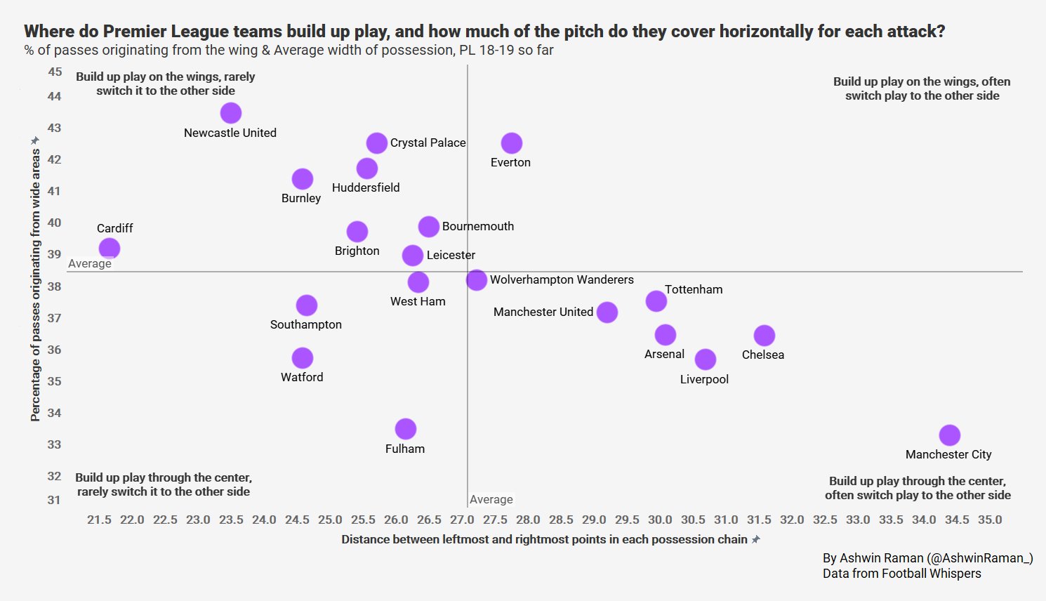 제가 영어가 짧아서 잘 모르겠는데 만약 goal이라는 표현이 득점이 되었을 때의 수치만을 사용한다고 가정한다면 유의미해지는 지표 같습니다. 제가 저기 나와있는 팀들 경기를 다 챙겨보지 않아서 잘은 모르겠지만 1,4사분면에 있는 팀들은 대체적으로 약팀들이고 결국 그런 약팀들이 득점을 위해 선택할 수 있는 전술들은 제한적이니까요.