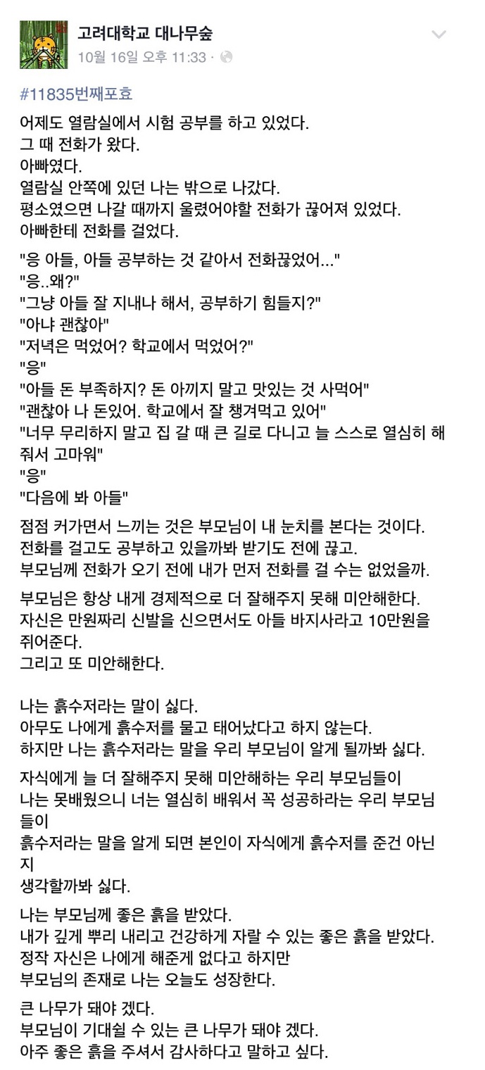 3721 고려대 대나무숲에 올라온 금수저, 흙수저에 관한 글.jpg 1 김치찌개 15/10/21 6837 0