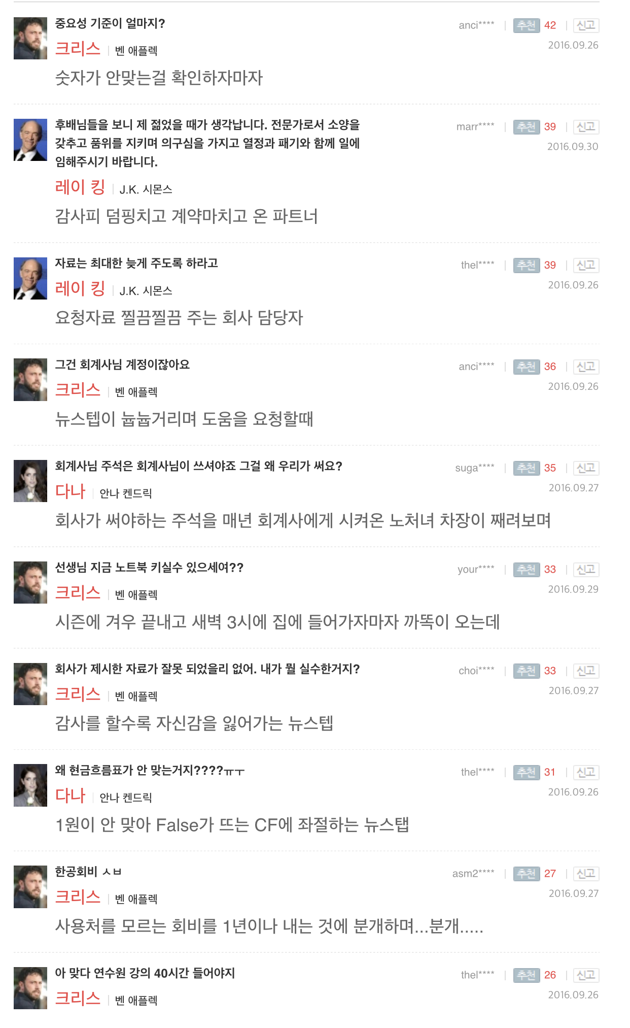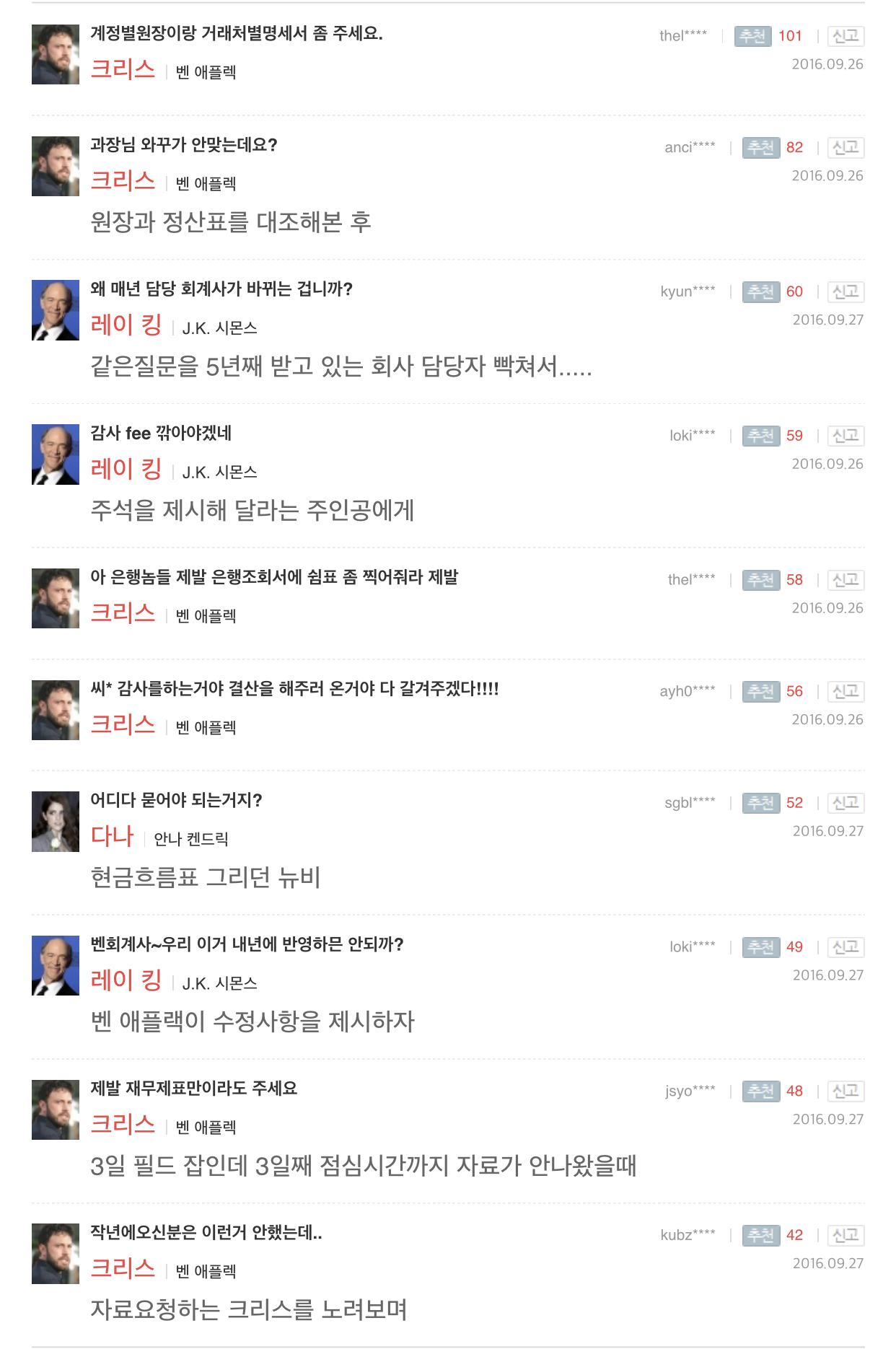 벤 에플렉 영화 어카운턴트 영화 소개를 유투브에서 보다가 어쩌다 보니 네이버영화 명대사 게시판 까지 가게 되었는데 명대사들의 상태가 ㅋㅋㅋㅋㅋ 현직 회계사분들 총출동 하신듯...