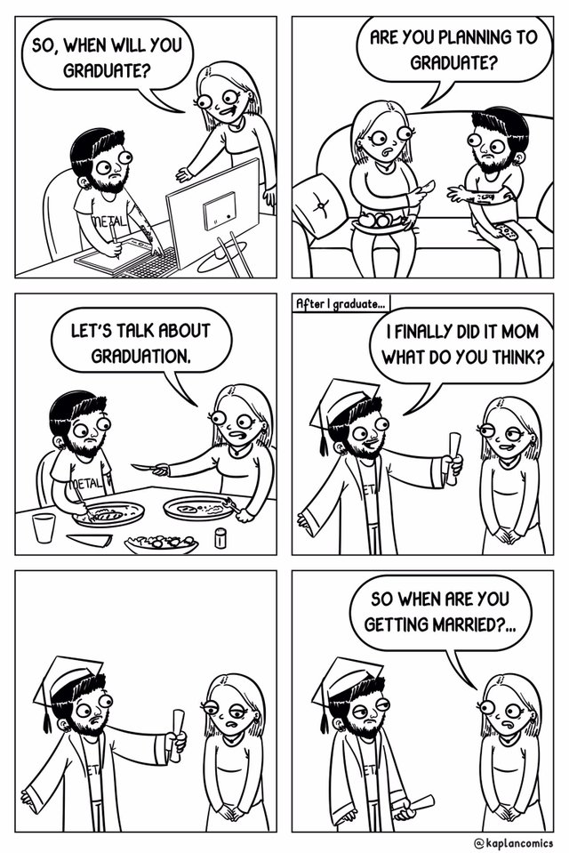 1. 졸업 언제할거니? 2. 졸업 준비하고 있니? 3. 졸업 이야기하자. 4. 드디어 졸업했어요, 엄마. 기분이 어때요? 5. ... 6. 결혼 언제할 거니? 0