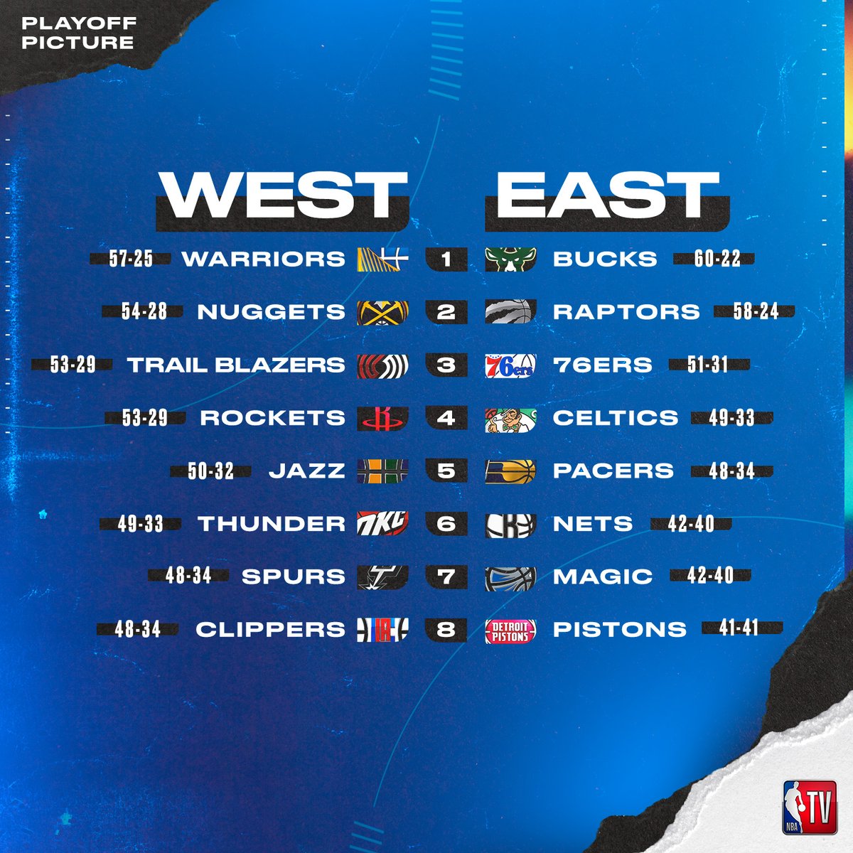West: - (1) Warriors vs. (8) Clips - (2) Nuggets vs. (7) Spurs - (3) Blazers vs. (6) Thunder - (4) Rockets vs. (5) Jazz East: - (1) Bucks vs. (8) Pistons - (2) Raps vs. (7) Magic - (3) Sixers vs. (6) Nets - (4) Celtics vs. (5) Pacers 마지막 날까지 동부 플옵막차 결정되지 않았고, 순위변동도 상당히 있는 등 오랜만에 다사다난한 시즌이었습니다. 르브론 없는 플옵도 정말 오랜만이죠. 0