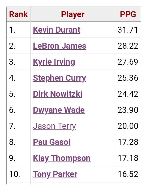 | Subject | NBA 통산 현역선수 파이널 평균득점 Top10 |