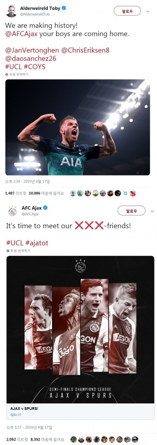 챔피언스리그 4강에 진출하고 아약스와의 대진이 정해지자마자 토비가 트위터에 남긴 글. 그리고 아약스 공식 계정도 이에 화답했습니다. 물론 다빈손 산체스 사기극 복수전이라고 말하기도 하지만.. 이 넷에게는 나름 뜻깊은 매치업이 되지 않을지. 0