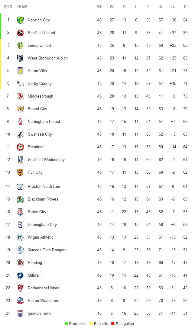 노리치 시티와 셰필드 유나이티드가 다음 시즌 프리미어리그 직행 승격 티켓을 따냈습니다. (사실 지난 라운드에 확정짓긴 했지만.) 그리고 리즈 유나이티드, 웨스트 브롬위치, 아스톤 빌라, 더비 카운티가 승격 플레이오프에 진출하게 되었네요. 마지막 라운드의 최대 관전 포인트는 과연 램파드의 더비 카운티가 6위를 지켜내며 승격 플레이오프에 진출하느냐였는데, 더비 카운티가 웨스트 브롬위치에게 동점골을 허용하는 와중에 미들스브로가 그 유명한 등딱신 존 오비 미켈의 골에 힘입어 순위를 뒤집어 버리나 했지만 더비가 추가 골들을 넣고 승리를 굳히며 역전당하지 않고 6위를 지켜냈습니다. 이외에 이청용의 친정팀, 볼튼 원더러스는 3부 리그로 강등. 0