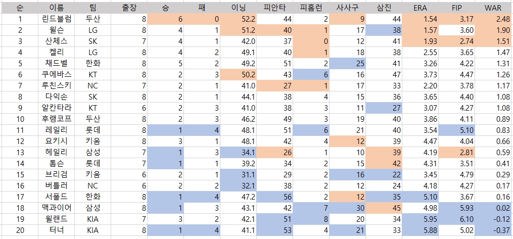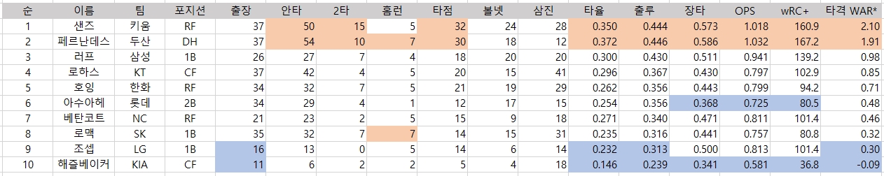 스탯티즈가 업무량이 많아서 그렇다고는 하는데 용병 선수들 카테고리도 제대로 표시를 못할 정도로 일이 많은지... 덕분에 손이 좀 갔네요. 성적이 괜찮은 카테고리는 빨갛게, 나쁜 카테고리는 파랗게 칠해보았습니다. 투수 쪽의 누적 스탯은 별도로 표시가 안되어있지만 따로 이닝으로 나눠서 색 구별을 했습니다. 확실히 이번 시즌 기아의 부진은 용병 투수 성적이 바닥으로 쳐박힌 영향도 있는 것 같네요. 반대로 팀 성적은 좋지 않지만 KT 투수들의 분전도 눈에 띕니다. 이번 시즌 초반 용병 투수들의 성적 특징은 두산이랑 한화 정도를 제외하면 팀 소속별로 투수들의 성적이 비슷하게 간다는 점? 지난 시즌에 좋은 모습을 보여줘서 잔류했던 타자 용병들이 올시즌에는 다소 힘들어하고 있는게 특징. 전체적으로 용병 타자들이 꽤 힘들어하는 가운데, 샌즈와 페르난데스가 군계일학 아니 군계이학(?)을 보여주고 있습니다. 샌즈는 지난 시즌 중도에 교체 선수로 들어와서 좋은 비율 스탯을 보여줬는데 이번 시즌에는 제대로 위력을 발휘하고 있군요. 성적이 별로인건 둘째치고 제대로 나오지도 못하고 있는 조셉과 헤즐베이커는 빠른 교체 루트를 밟을지도 모르겠습니다. 일단 조셉 같은 경우에는 다음주까지 돌아오지 못한다면 교체를 진행할거라고 차명석 단장이 못박았더군요. 0