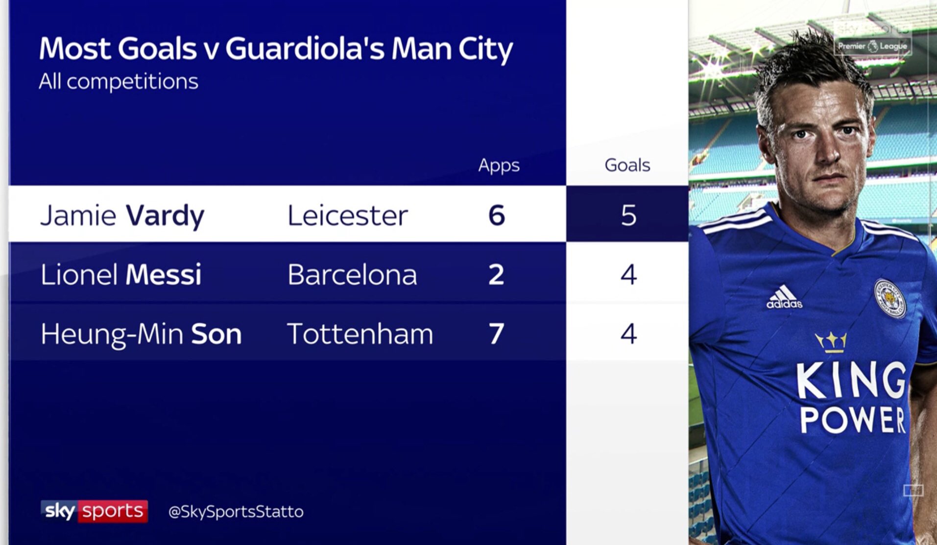 지금까지 펩 과르디올라가 리그 타이틀을 따낸건 총 7번인데, 그 중 최종 라운드까지 우승을 확정 짓지 못한 건 딱 1번이었습니다. 2009-10 시즌 그 티키타카 바르셀로나 시절이네요. 그 시즌에 승점 99점을 따고도 최종 라운드까지 우승을 확정 짓지 못했다는게 유머입니다. 9년 전 펩의 피해자(?)가 되었던 사람은 무리뉴가 오기 전 레알 마드리드를 맡았던 펠레그리니. 그리고 둘째 짤은 경기 전 기준입니다. 펩 시티를 상대로 가장 많은 골을 넣었던 제이미 바디는 결국 골을 기록하진 못했지만 그래도 펩 시티 상대 최다 득점자 타이틀을 보유 중. 그 밑에는 손흥민도 랭크되어 있습니다. 그런데 가운데 있는 저 분은 EPL에 계시지도 않으신 분이 왜 저기에... 레스터 시티는 패배를 기록하긴 했지만 걔 중에서도 제일 졌잘싸한 편입니다. 오늘 콤파니는 70분에 골을 넣었는데 오늘 레스터 시티는 올시즌 맨시티 원정에서 60분 넘게 실점하지 않은 유일한 팀이라고.. 또한 맨체스터 시티는 클린시트 승리를 기록하였고 에데르송은 리그 20번째 클린시트를 기록했습니다. 이 기록은 현재 알리송과 동일. 가장 최근 단일 시즌 20 클린시트 골키퍼가 2명 나왔던건 08-09 시즌이라고 하네요. 그 때에는 반 데사르와 레이나. 결과적으로 이번 시즌 맨체스터 시티의 홈 경기 성적은 18승 1패. 프리미어리그 역사상 홈 경기 18승을 기록한 4번째 팀이 되었습니다. 마찬가지로 홈 경기 18승을 기록했던 이전 3팀은 05-06 첼시, 10-11 맨유, 11-12 맨시티. 0