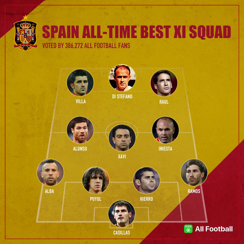 https://twitter.com/allfootballapp/status/1049969737780748288 작년 10월에 뽑은 스쿼드긴 하네요. 그 때와 마땅히 큰 변화는 없겠지만... 스페인 현지 팬들 조사는 아닌거 같고 그냥 축구 팬 대상인듯. 디 스테파노를 여기다 넣는게 맞느냐 아니냐가 이슈일 것 같네요. 0