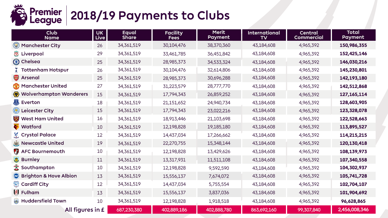 https://www.premierleague.com/news/1225126 Facility Fees는 중계 횟수이고 Merit Payment 순위별 상금이라고 합니다. 중계권료만해도 금액이 어마어마하네요. 0