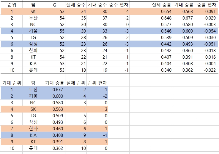실제 승률이 기대 승률보다 높은 팀들은 빨갛게, 실제 승률이 기대 승률보다 낮은 팀들은 파랗게 칠해보았습니다. 이전에 제가 올리던 자료들보다 색칠 기준 자체를 좀 완화시킨 것도 있지만 올해는 작년에 비해 꽤 안정적인 승률 분포를 보이는 것 같네요. 재미있는건 최근 무세운 상승세를 보이는 삼성의 승률이 오히려 저평가 쪽으로 보여지고 있다는 점. 기대 승률로만 따진 순위로는 변화가 없지만요. 0