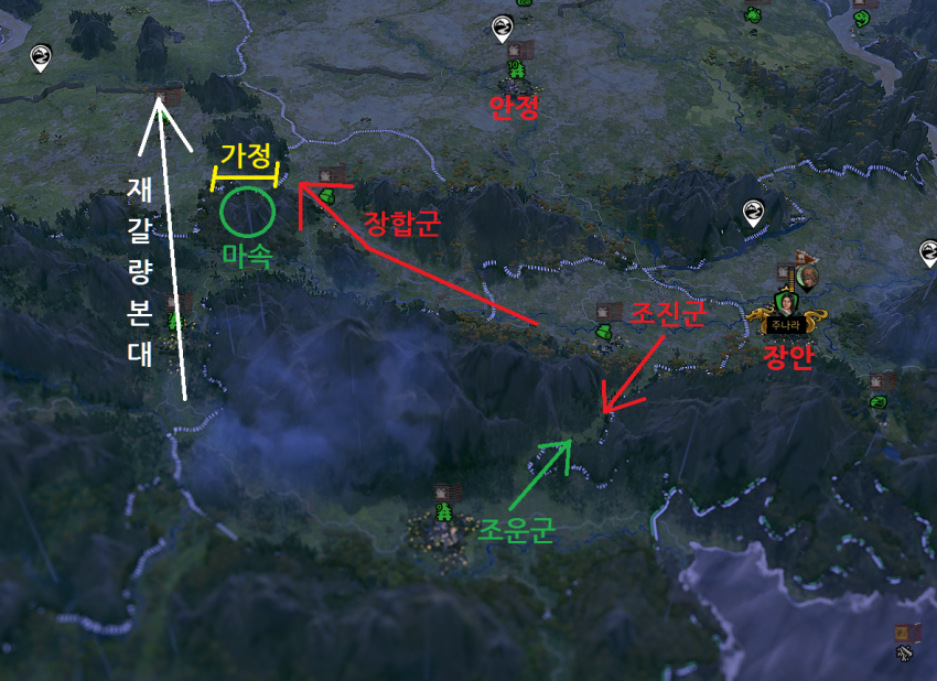 삼탈워 한중, 장안, 안정, 무도가 같이 찍힌 맵임. 1) 제갈량이 북벌을 하기 위해서 제갈량이 직접 부대를 이끌고 위의 사진에서 보이는 조운군 방향으로 장안을 칠 거다! 라는 소문을 퍼트림 2) 거기에 낚인 조진이 제갈량 본대인 줄 알았던 조운군과 조우하고 같이 둥가둥가 데이트 하게 됨. 3) 조진이 낚여서 안정 부근에 남아 있는 위나라 부대는 곽회랑 서막 뿐이었음 4) 이제 위나라 부대가 망치 휘둘러서 뒷통수 깨려면 가정 쪽을 통해서 넘어오는 수 밖에 없었음 5) 그리고 여기서 마속이 등장해서 가정 길목에다가 진을 치고 막기만 해라 라는 명령을 받음 6) 마속 "산이 더 좋은데?" 하고 산에 가서 진을 침 7) 구원대로 급히 달려온 장합은 이 새끼는 병신인가 하고 맵에서 보이는 산 바로 아래에 있는 물길을 끊어버림 8) 그리고 가정 다 뚫리고 곽회 넘어오고 장합한테 두들겨 맞고 마속은 모가지 날아감 ---- 가정의 달은 아직 끝나지 않았습니다!! 0