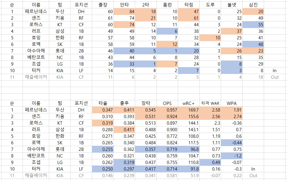 성적이 괜찮은 카테고리는 빨갛게, 나쁜 카테고리는 파랗게 칠해보았습니다. 누적 스탯은 따로 경기수로 나누어서 계산한 뒤에 색 구별을 했습니다. 부진에 빠져있던 로맥이 페이스를 슬슬 올리기 시작한 것을 빼고는 지난 달과 대동소이합니다. 해즐베이커 대신 들어온 터커의 성적도 썩 좋지 못하다는게 기아 팬분들에게는 아쉬울듯. 물론 지금은 적응기라고 봐줄수도 있겠습니다만.. 0