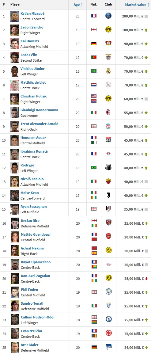 이라고 해봤자 그냥 20세 이하 유명한 선수들 쫙 나열하면 됩니다. 객관적인 척도는 없으니 트랜스퍼마크트의 마켓밸류 값을 이용해보겠습니다. 이 가격은 절대 시장가격도 아니고 적정가격도 아니니 후스코어드 평점만큼이나 재미로 참고하시는 것을 권장드립니다. 25위권 선수 중에서 U-20 월드컵에 출전한 선수는 20위 자가두와 24위 은디카 뿐입니다. 둘 다 프랑스 대표팀으로 출전했으나 16강에서 미국에게 일격을 당하며 탈락. 그리고 캡쳐에는 생략했지만 50위권까지 살펴봤을 때, 네임밸류가 좀 알려진 선수들이 누가 있는지 알아봤는데 로마의 저스틴 클루이베르트, 아스날의 리스 넬슨, 레알 마드리드의 브라힘 디아즈, 맨체스터 유나이티드의 디오고 달롯, 에버튼의 톰 데이비스 등이 있더군요. 이 중 달롯은 이번 U-20 월드컵 대회에 참여했습니다. 이 선수들의 연령별 국가대표팀 기록을 좀 살펴봤는데, U-20 월드컵이 2년 단위로 열리는 것에 발맞추어 유럽 내에선 U-21 챔피언쉽이 개최되더군요. 그래서 싹수(?)가 좋은 유럽 국적의 선수들은 U-20 대신 U-21에 콜업되어서 기량을 연마하는 경우가 많았습니다. 해외에서는 상위 연령별 대표팀에 뽑히면 어지간해서는 아래 단계 대표팀에 소집하지 않는 경향성이 있습니다. 물론 아예 그것도 건너뛰고 성인 대표팀에 뽑히는 괴물들도 여럿 보이지만요. 참고로 한국의 이강인은 이 리스트에서 98위에 위치해 있었습니다. 그래도 18살로 한정하면 12위쯤 되더군요. 0