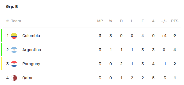 2019. 06. 23. Colombia 1 (Cuellar 31') - 0 Paraguay 2019. 06. 23. Qatar 0 - 2 Argentina (L.Martinez 4', Aguero 82') 아르헨티나가 카타르를 잡고 8강에 진출했습니다. 동시에 8강을 미리 확정지어놨던 콜롬비아가 파라과이에게 승리를 거두면서 아르헨티나는 2위로 8강에 진출. 8강에서 베네수엘라랑 만나게 되는 것 같네요. 대진표 대로라면 아르헨티나와 브라질이 4강에서 만날 수도 있게 됩니다. 과연 메시는 토너먼트에서 자신의 눈물을 닦을 수 있을 것인가 1