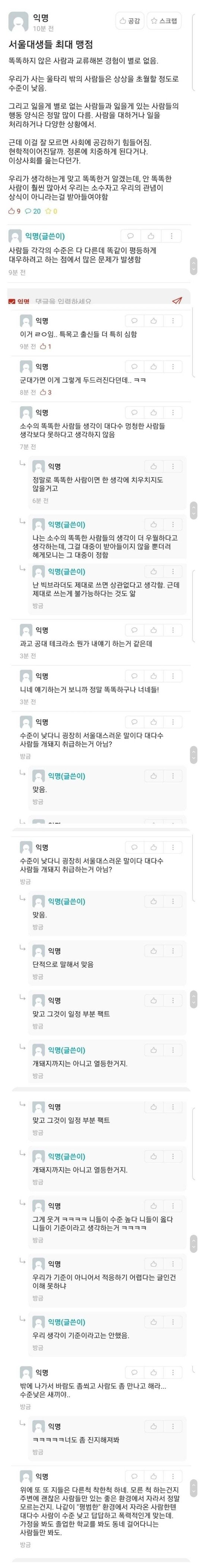 어... 에브리타임에 그 학교 학생은 없다는게 정설이라던데 걍 서울대생인 척 하는거겠죠. 살면서 전현직 서울대생들 중에 저런 친구들 단 한명도 못봤는디.