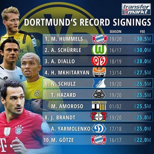 물론 풀리시치를 비싸게 팔아먹어서 실탄이 많이 쌓였기 때문이기도 하지만, 이번 이적 시장에서 지출한 금액만 따지면 벌써 100m 가까이 되고 있습니다. 팀 내 영입 레코드 상위권도 여럿 갈아치우면서 분노의 영입 중인 도르트문트. 1