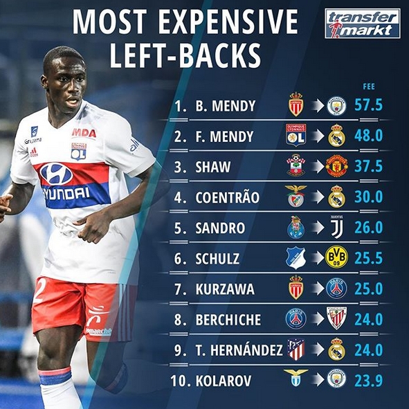 귀하기 귀하다고 소문난 왼쪽 풀백 이적료 순위. 멘디 형제가 나란히 1, 2위에 위치했습니다. 선수들 면면을 보면 애초에 풀백들은 시장에서 거래 자체가 활발하지 않다고 보는게 맞겠죠. 풀백이 참 애매한게 매물은 없고 가격은 비싼데 보강 우선순위에서는 타 포지션에 비해 앞선다고 보기도 힘들어서... 0
