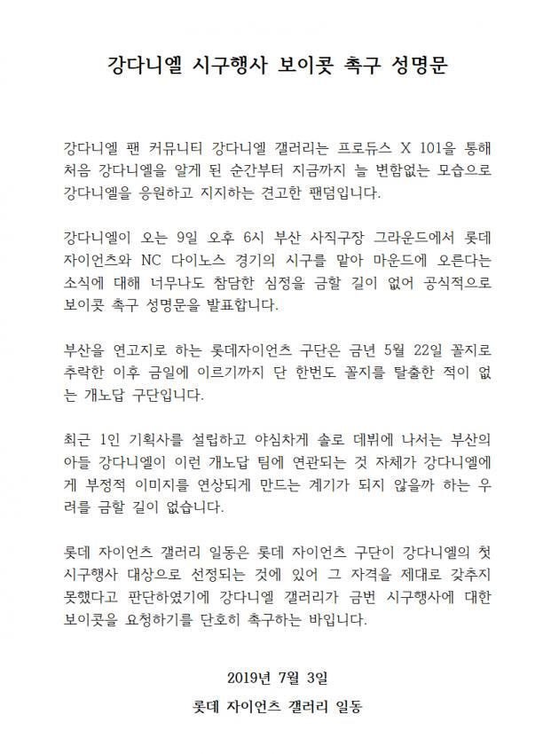 Subject   강다니엘 시구행사 보이콧 촉구 성명문