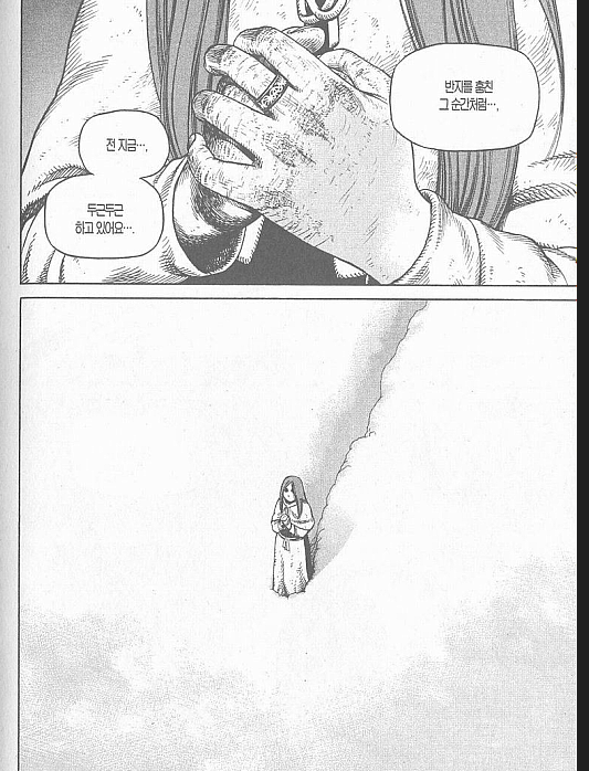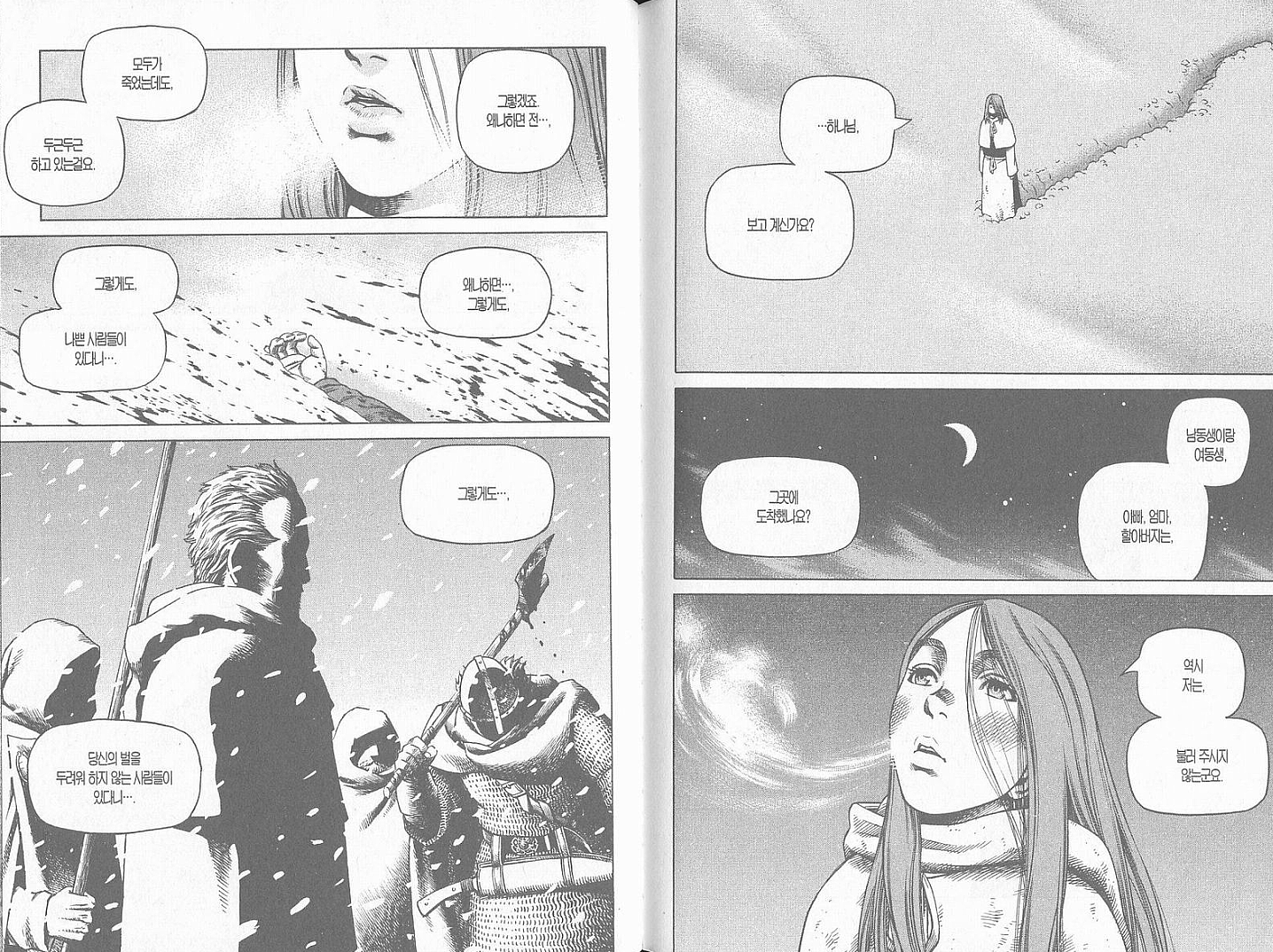 코믹스 '빈란드사가' 中. 독실한 기독교 마을에 살던 잉글랜드 소녀가 신의 윤리 따위 쌩까버리는 무도한 불한당 바이킹들이 자신의 일가족과 마을 사람들을 모두 몰살시키는 걸 목격하고 도망치는 장면... 반지 저거 NBA 우승 반지 말하는 거겠죠? 0