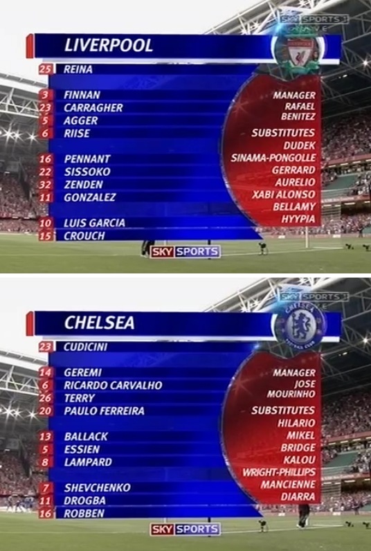 2006. 08. 13. Liverpool 2 (Riise 9', Crouch 80') - 1 Chelsea (Shevchenko 44') 리버풀이 가장 마지막으로 커뮤니티 실드 경기를 가진건 2006년입니다. 2005-06 시즌 FA컵 우승팀 자격으로 출전해 전시즌 리그 우승 팀인 무리뉴의 첼시와 맞붙었는데 승리를 거뒀었죠. 이렇게 보니까 로벤옹이 참 오래도 뛰었네요. 참고로 저 골이 셰브첸코의 공식 경기 데뷔골입니다. 0