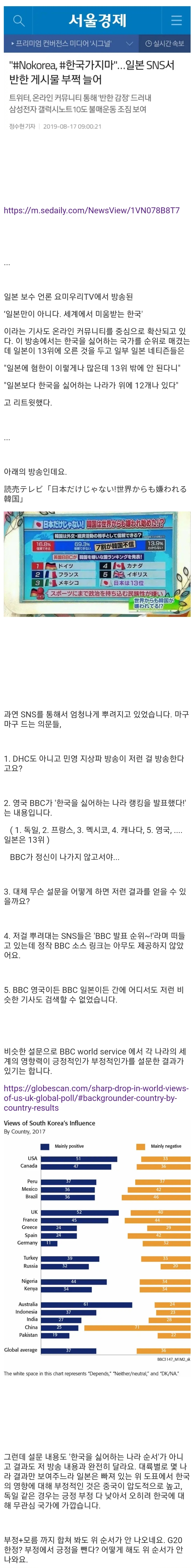 요미우리TV "日만이 아냐! 세계에서 미움받는 한국" https://m.sedaily.com/NewsView/1VN078B8T7 https://globescan.com/sharp-drop-in-world-views-of-us-uk-global-poll/#backgrounder-country-by-country-results 조작을 안하면 혐한을 못합니다. 0