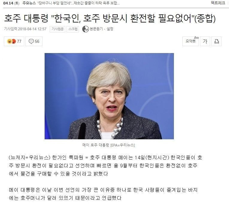 | Subject | 호주 대통령 "한국인 호주 방문시 환전 필요 없어" |