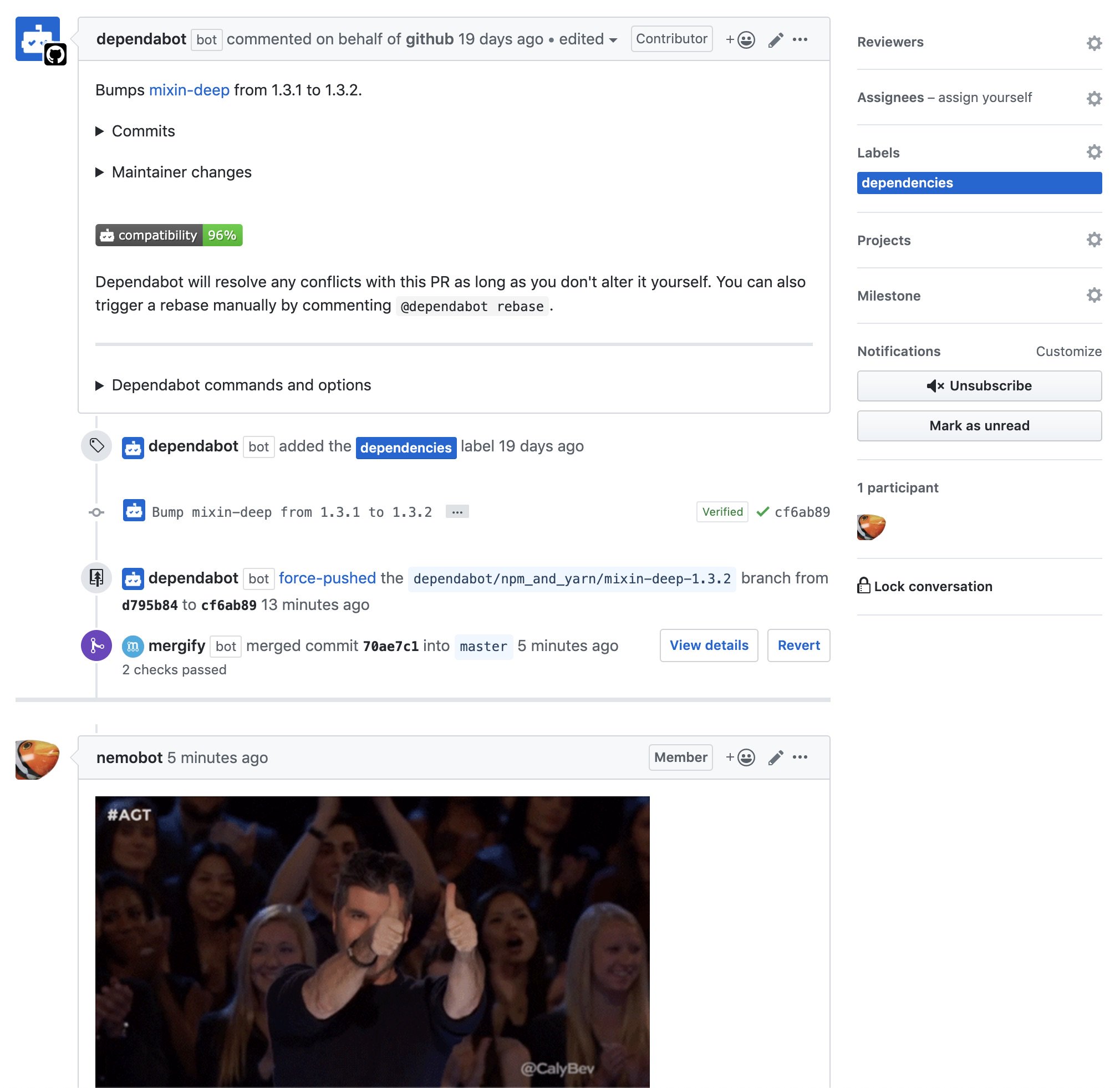 [github bot들의 대화] - 봇이 의존성부분에서 취약점 발견 - 봇이 수정을 위한 PR(수정안) 보냄 - CI 가 PR 을 검증 - 봇이 PR 머지(수정 수락) - 봇이 머지를 GIF로 축하 https://twitter.com/gabro27/status/1173547934132178944 개발 - 검수 - 승인 - 축하 모두 로봇으로 자동화 함 5
