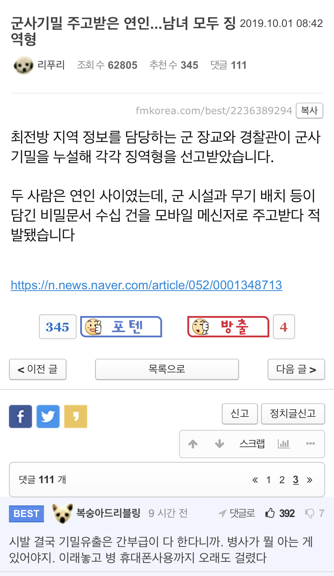 | Subject | 군사기밀 주고받은 연인...남녀 모두 징역형 |