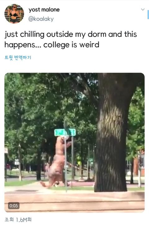 3년전 : (공룡탈 쓰고 개 산책중인 사람 사진) 대학에 이상한 새끼 많네