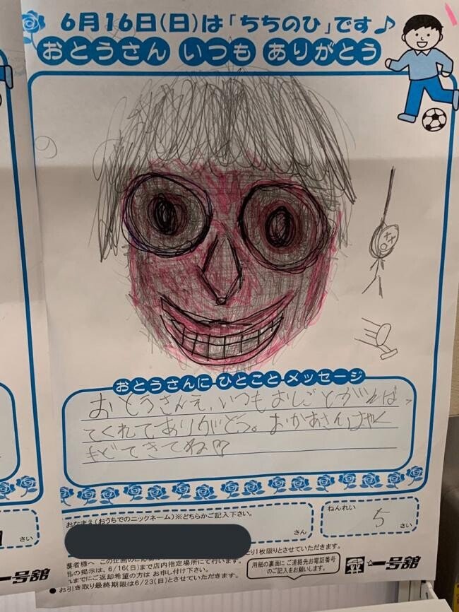 6月16日(日)は「ちちのひ」です 6월 16일(일)은 [아버지의 날]입니다 おとうさんいつもありがとう 아빠 늘 고마워요 (그림) おとうさんにひとことメッセージ 아빠에게 한마디 메시지 ┌적힌 글귀┐ おとうさんえ、いつもおしごとがんばてくれてありがとう。おかあさんはやくもどてきてね♡ 아빠에게, 언제나 일 열심히 해줘서 고마워. 엄마 빨리 돌아와줘♡ ねんれい5さい 연령 5살(5세 - 한국나이 6~7살) 그림이 섬뜩하네요.. 0