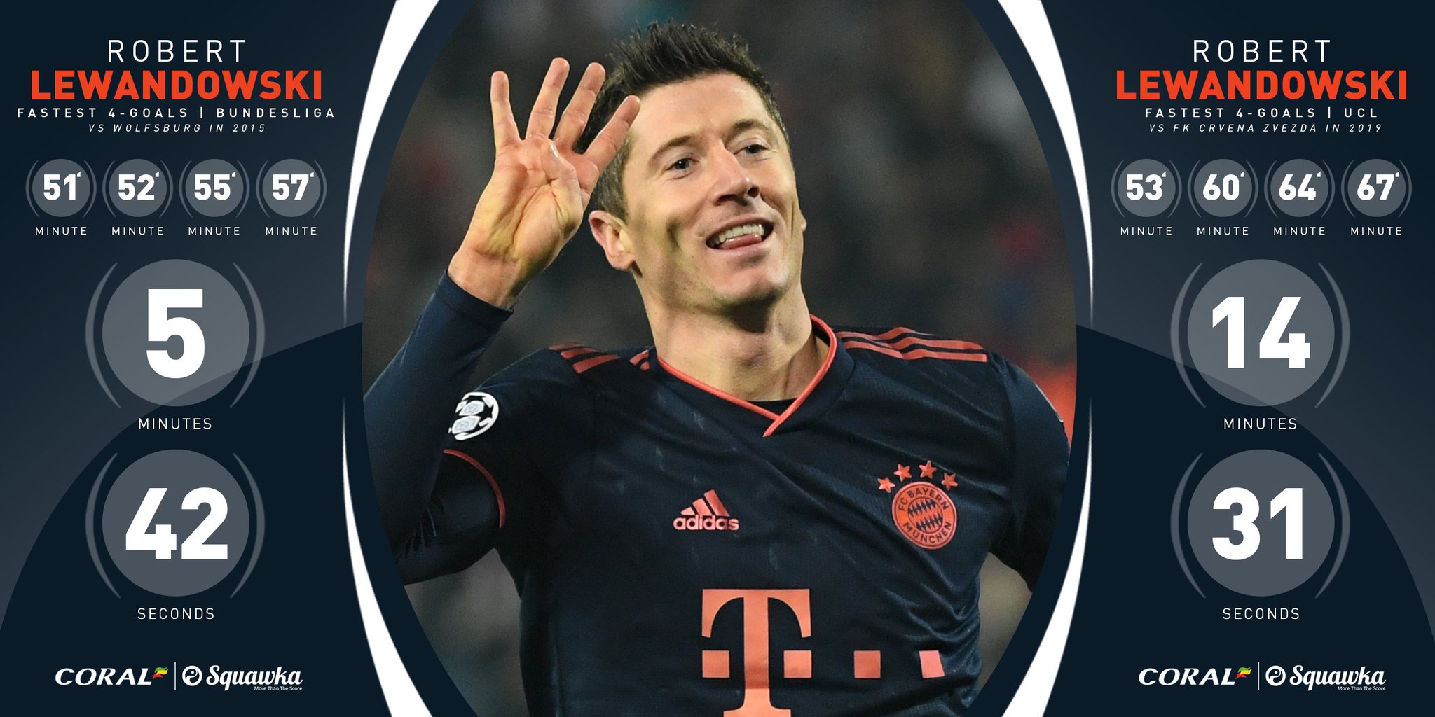 2019. 11. 26 Red Star 0 - Bayern (Lewandowski 60', 64', 68') 53분에 PK로 한 골을 넣더니 15분 안에 3골을 더 몰아넣은 레반도프스키. 지난 리그 경기에서 골 못넣더니 그 몫까지 몰아넣었나 봅니다. 레반도프스키는 이전에 분데스리가에서 9분동안 5골을 넣은 전력이 있죠. 공식 기록은 14분 31초로 당연히 챔피언스리그 최단 기록. 레반도프스키는 이번 경기에서 토마스 뮐러의 골 기록을 넘어서 바이언 역대 챔스 득점 1위에 등극했습니다. ![]() 그리고 레반도프스키는 이번 시즌 챔피언스리그 5경기 모두에서 골을 넣고 있습니다. 첫 5경기에서 모두 골을 넣은 선수들은 역대 5명 뿐. ![]() 챔피언스리그에서 서로 다른 두 팀을 상대로 4골을 기록한 선수는 메시 한 명이었는데 이제 레반도프스키가 추가되었습니다. ![]() 그리고 레반도프스키는 챔피언스리그 60골을 돌파. 벤제마와 함께 라울을 맹추격 중이네요. 레반도프스키의 이번 시즌 모든 대회 기록은 20경기 27골입니다. 0
