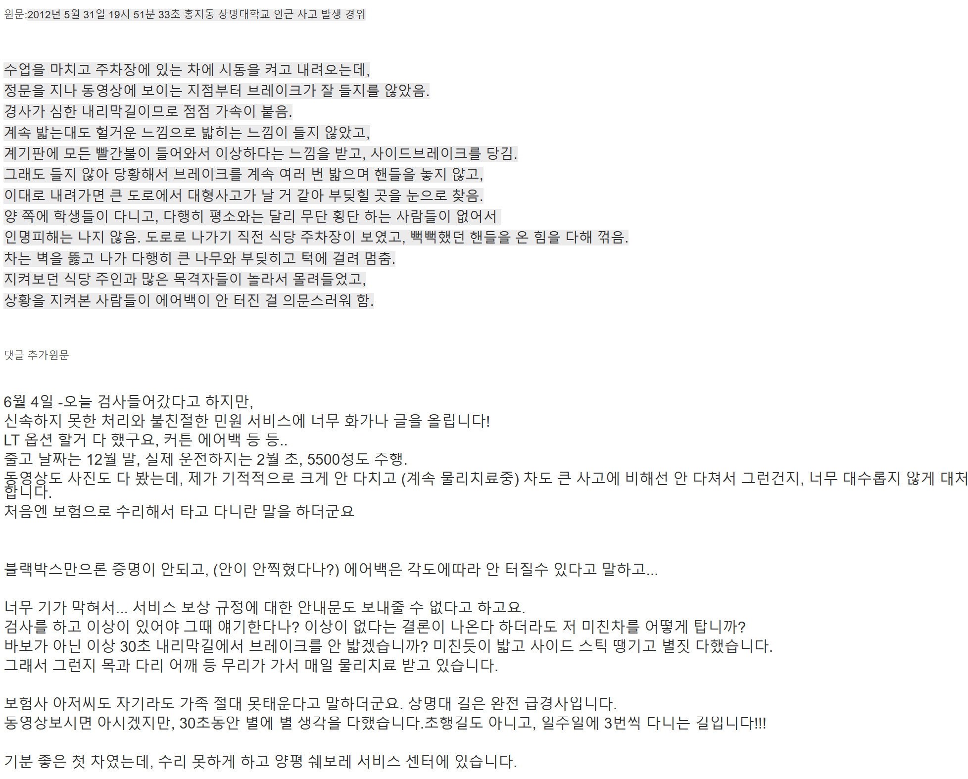자동차 회사에서는 차량 결함이 아니라 운전 미숙으로 봤다고 하는데 저게 운전 미숙이라니.....