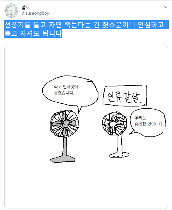 | Subject | 선풍기를 틀고 자면 죽는다는 건 헛소문이니 안심하고 틀고 자셔도 됩니다 |