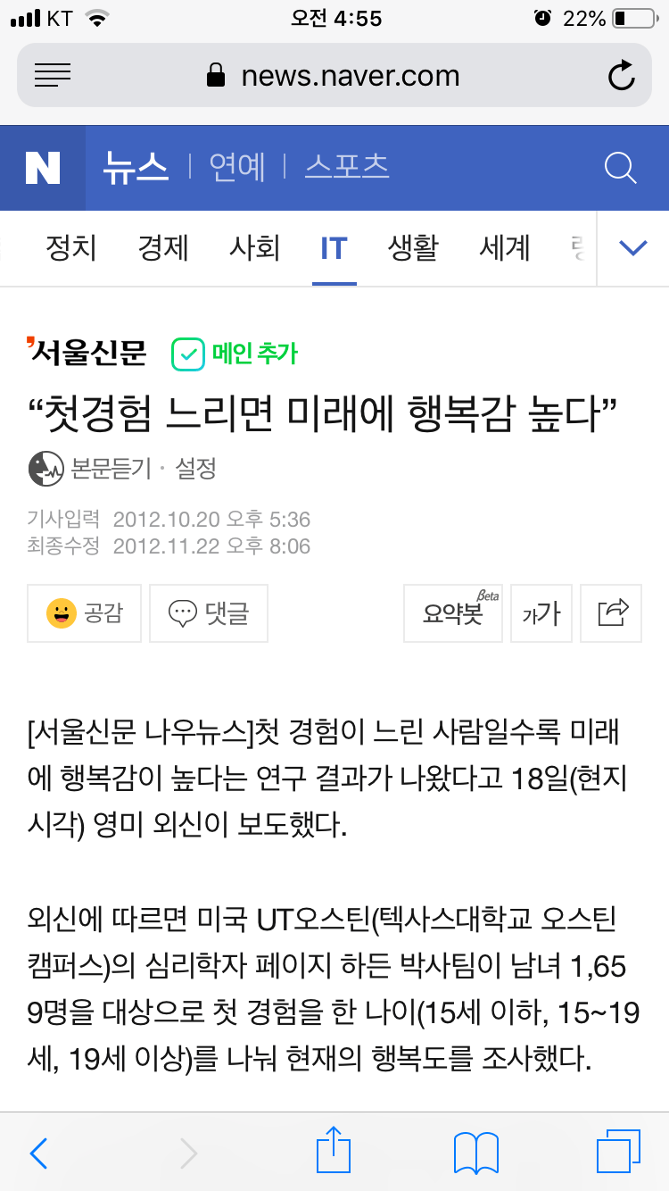 | Subject | "첫 경험 느리면 미래에 행복감 높다." |