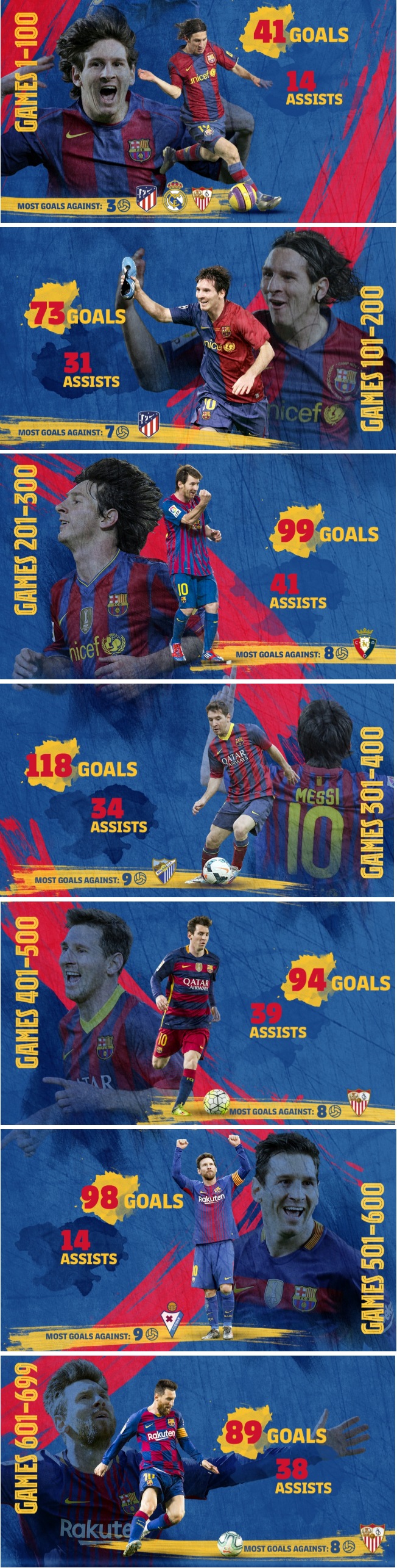 https://www.fourfourtwo.com/features/lionel-messi-barcelona-goals-record-700-games-career-numbers-assists-hat-tricks 지난 챔스 도르트문트 전에서 커리어 700경기를 달성한 메시. 그리고 아틀레티코 마드리드 전까지 뛰었으니 지금은 701경기째가 될 겁니다. 물론 짤은 699번째 경기까지 표시한 것 같지만요. 가장 첫 100경기 스탯이 제일 모자란데, 현실은 메시의 드리블 돌파 능력에 저 정도 스탯만 쌓아줘도 월드클래스에 손색이 없다는게... 1