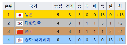 2019. 12. 17. 한국 0 - 1 일본 아쉽게도 88분에 PK 골을 허용하며 패배하고 말았습니다. 일본은 무실점 전승을 달성했네요. 12월 발표된 여자축구 피파 랭킹은 일본이 10위, 중국이 15위, 한국이 20위더군요. 1
