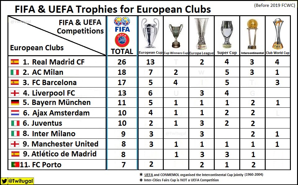 2019. 12. 21. Liverpool 1 (Firmino 99') - 0 Flamengo 0-0으로 연장까지 갔는데 피르미누의 결승골로 리버풀이 우승을 차지했습니다. 이번 우승은 리버풀의 클럽 월드컵 첫 우승이고, 잉글랜드 클럽에게는 2008년 맨유에 이어서 2번째라고 하네요. 위에 피파, 유에파 트로피 현황은 이번 클럽 월드컵 대회 직전까지의 기록입니다. 0