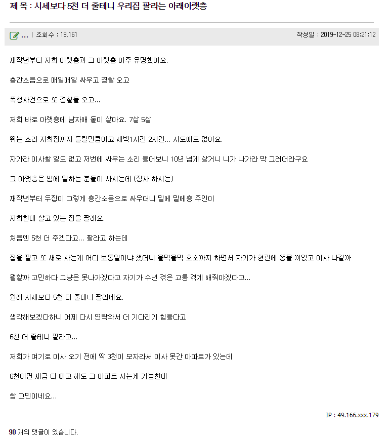 | Subject | 시세보다 5천만원 더 줄테니 우리집 팔라는 아래아랫층 |
